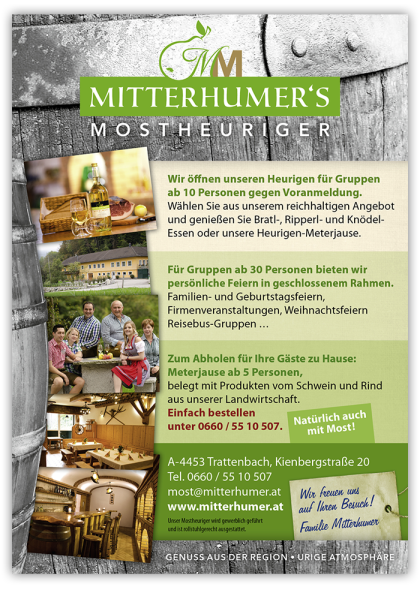 Wählen Sie aus unserem reichhaltigen Angebot und genießen Sie Bratl-, Ripperl- und Knödel-Essen, Heurigen-Meterjause oder gestalten Sie mit uns Ihr individuelles