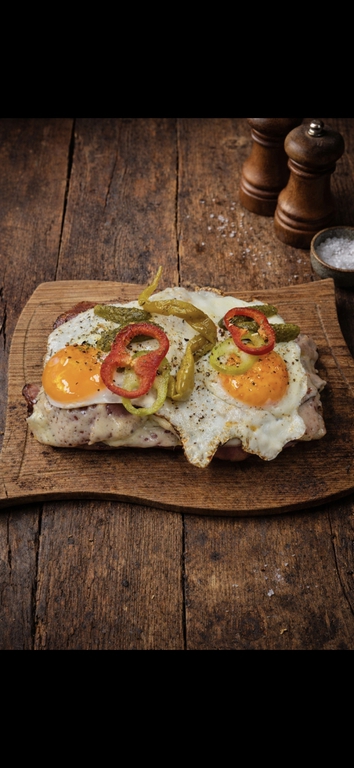 Mit gebratenen Zwiebeln, Käse, Spiegelei, Tomaten und Paprika