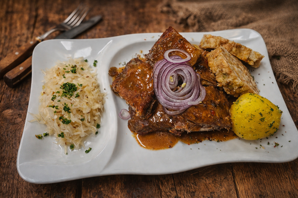 Mit Serviettenknödel, Kartoffeln und warmem Speckkrautsalat